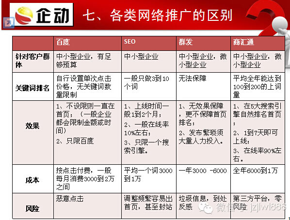 一 .網(wǎng)絡(luò)營(yíng)銷推廣的現(xiàn)狀? 1、網(wǎng)絡(luò)營(yíng)銷成為新時(shí)代的寵兒!互聯(lián)網(wǎng)的發(fā)展,讓越來越多的人開始重視并選擇網(wǎng)絡(luò)營(yíng)銷推廣!網(wǎng)絡(luò)營(yíng)銷大大改變了企業(yè)的營(yíng)銷方式! 二.企業(yè)網(wǎng)站宣傳推廣新助手-商匯通 "商匯通"是國(guó)內(nèi)首家專注于搜索引擎首頁(yè)精準(zhǔn)營(yíng)銷的電子商務(wù)云銷平臺(tái),整合企動(dòng)公司8年技術(shù)積累和優(yōu)秀合作平臺(tái),幫助客戶實(shí)現(xiàn)成百上千個(gè)精準(zhǔn)關(guān)鍵詞自然排名8大搜索引擎首頁(yè),方便、快捷、穩(wěn)定實(shí)現(xiàn)企業(yè)搜索引擎推廣。 三.選擇我們的十大理由 1、五大搜索引擎首頁(yè)排名推廣! 四.商匯通和百度推廣競(jìng)價(jià),官網(wǎng)優(yōu)化比較 |
